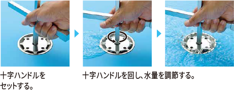 本製品中央の□10mmの穴に十字ハンドルを挿入し左右に回すことで排水量の調整が可能です。