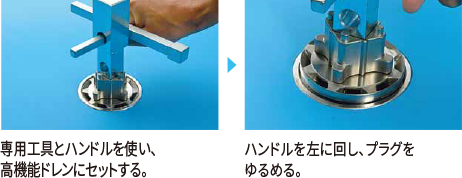 既存ドレンとのプラグ交換や、故障等による交換時は、本製品4カ所の丸穴に専用工具を挿入し、専用工具の四角穴へドレンアタッチメントを挿入し、ドレンアタッチメントの横穴に十字ハンドルを通した状態で左右へ回していただくとプラグの着脱が可能となります。