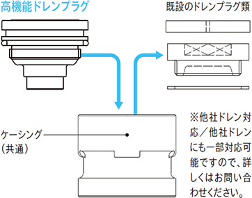 既存ドレン(SD/FD-50・65)とケーシングは共通ですので、既設のドレンプラグ類を外し、高機能ドレンプラグのみを取付けることで簡単に高機能ドレンの利用が可能となります。