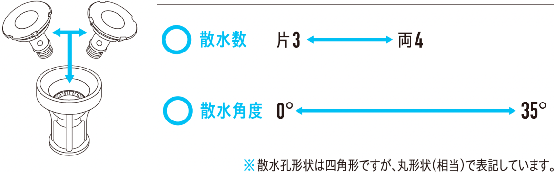 散水数 散水角度 散水孔径(φ)(mm) 接続口径(φ)(mm) 片面3孔 0° 2.5 22 35° 3 22 両面4孔 0° 2.5 22 35° 3 22