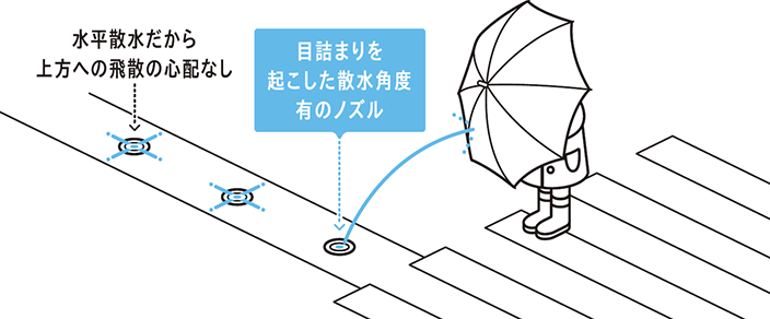 新たに散水角度0°の水平散水式を追加。水平散水で目詰まりしても上方へ大きく飛散することがないため、歩道や歩行者にも優しく、車にも直接水がかかることもないため安心です。