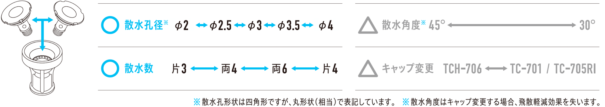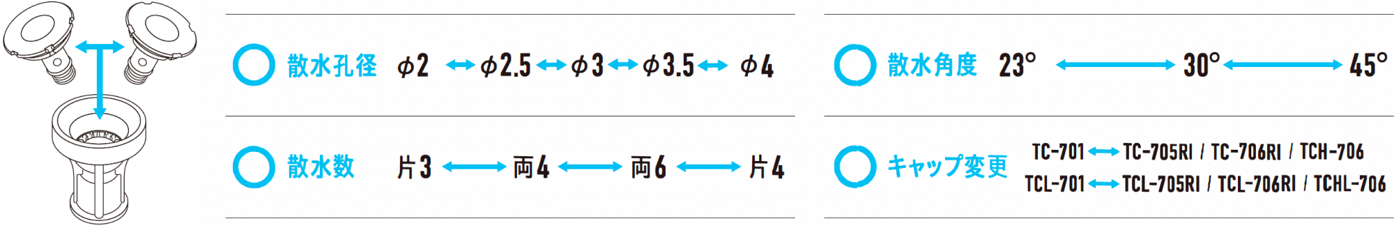 埋設後でも下記項目が○のものは、散水キャップを変更することで仕様変更できます。